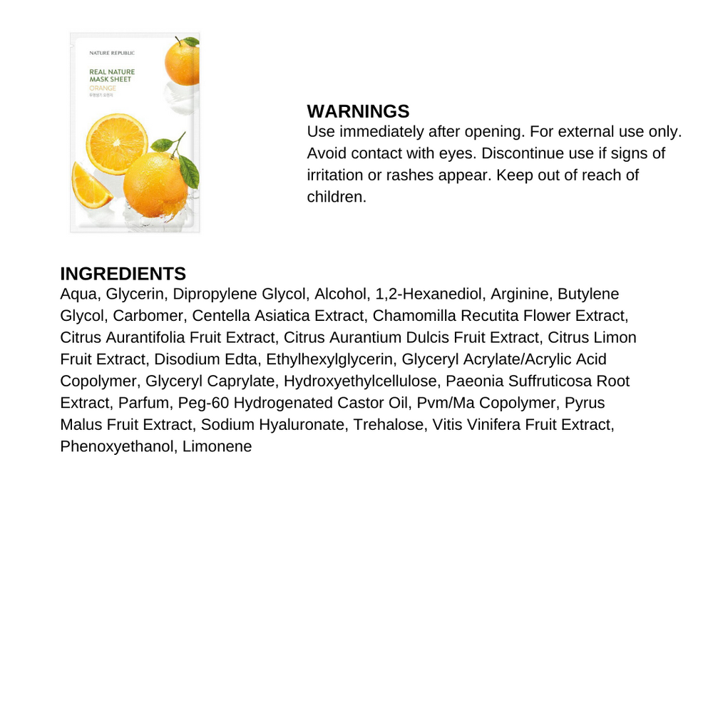 Our Real Nature Orange Mask Sheet contains orange extract helping refine dull skin tone.