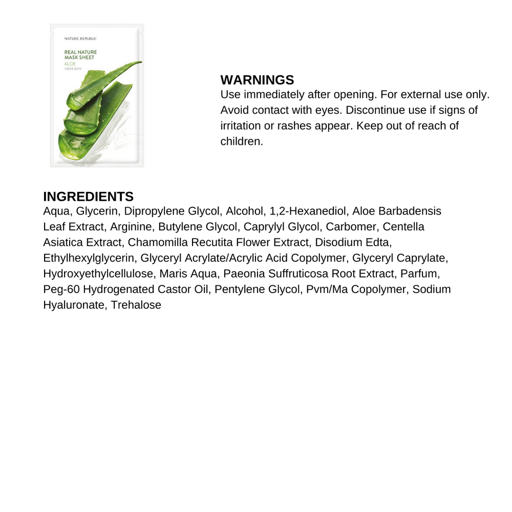 Our Real Nature Aloe Mask Sheet contains aloe extract that provides rich nourishment and is soothing for the skin.